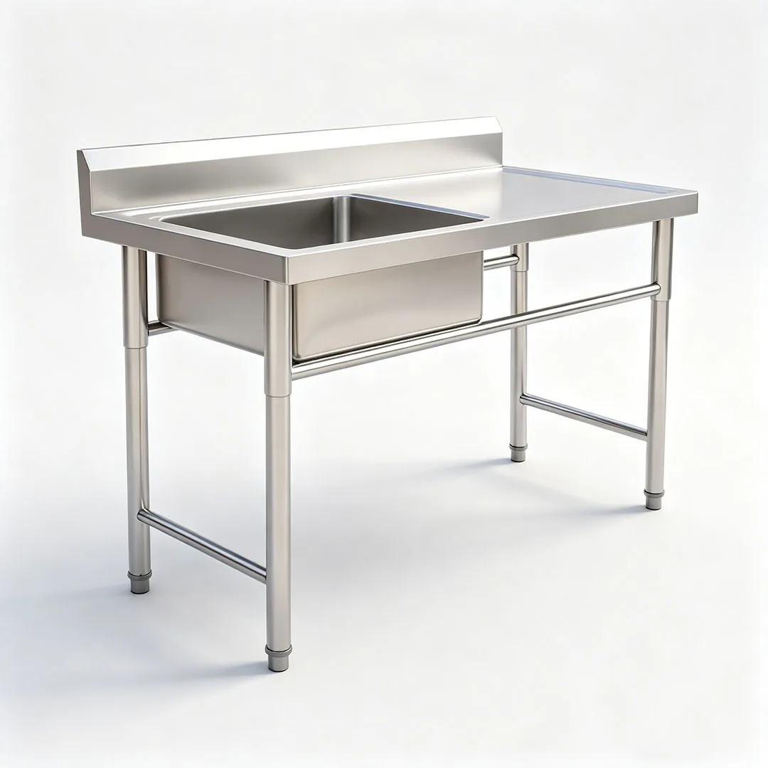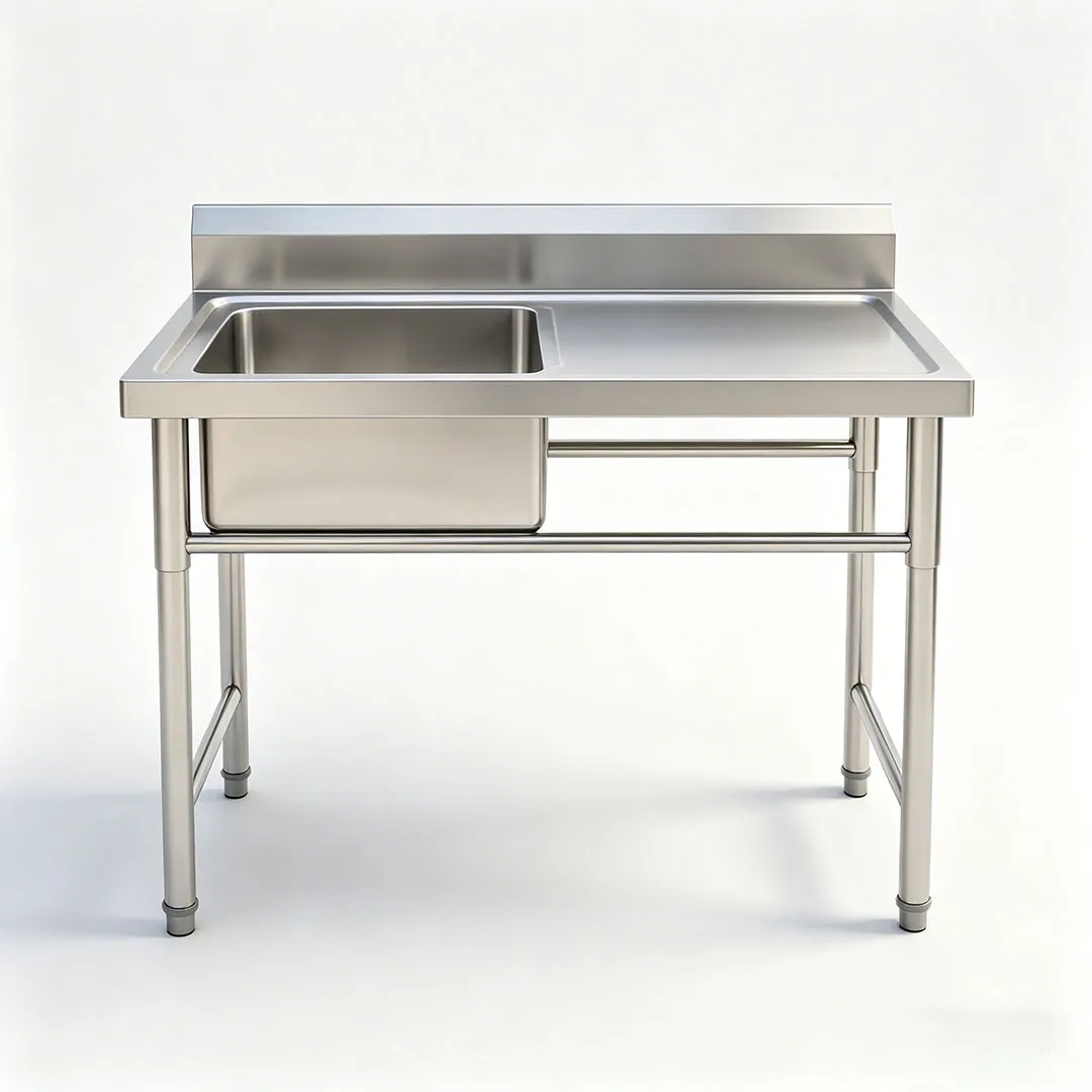 Конструкция, безопасная для пищевых продуктов: весь блок (чаша раковины, сливная доска и рама) изготовлен из пищевой нержавеющей стали — непористой, нетоксичной и соответствующей гигиеническим нормам коммерческого общественного питания, эффективно предотвращающей рост бактерий и перекрестное загрязнение.